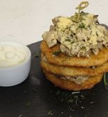 ЕщеКафе предлагает отведать нежные драники с шампиньонами, луком, салатом фриз, зеленью и сметаной
