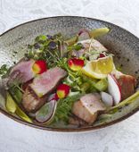 | Форель малосоленая на листьях салата с лимоном | от 12 руб. |
