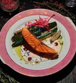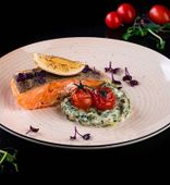 | Лосось на шпажках, с цуккини, томатом черри на подушке из лука порея | от 24 руб. |
