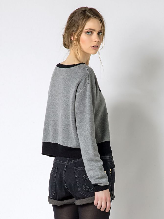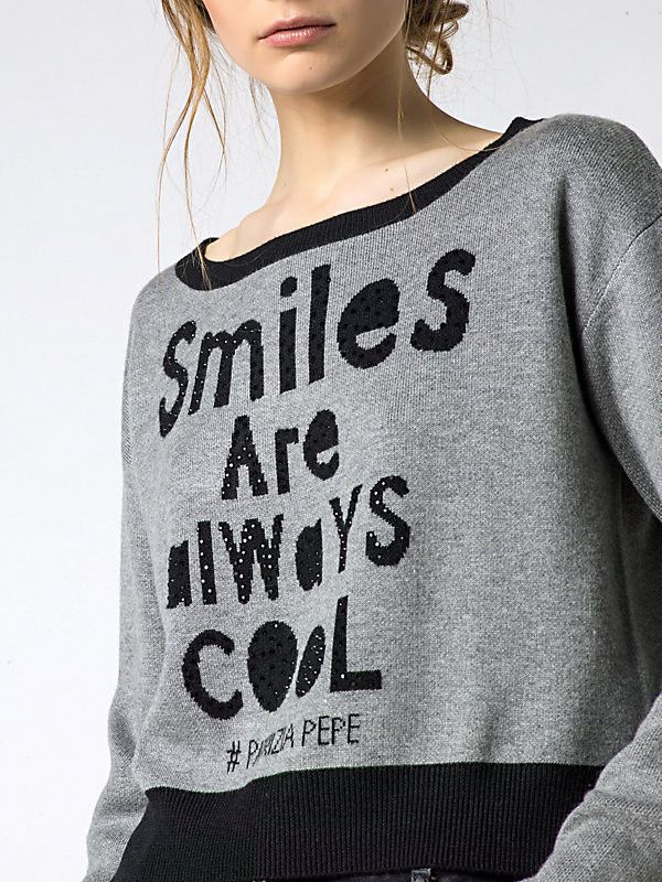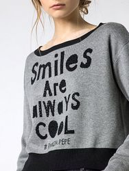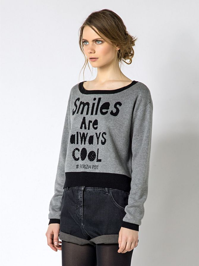 Свитер с круглым вырезом с длинным рукавом из смешанной пряжи с кашемиром, color block, со стразами, с надписью и логотипом Patrizia Pepe, с разрезом по бокам.