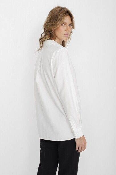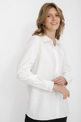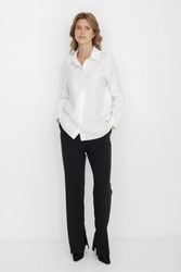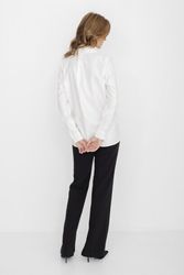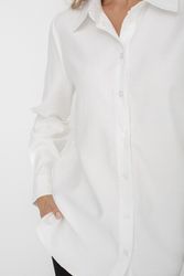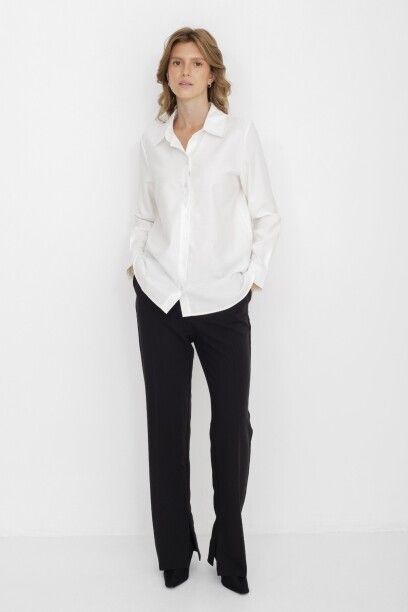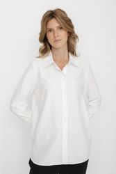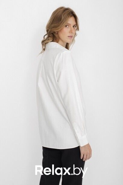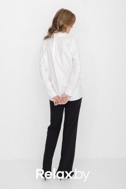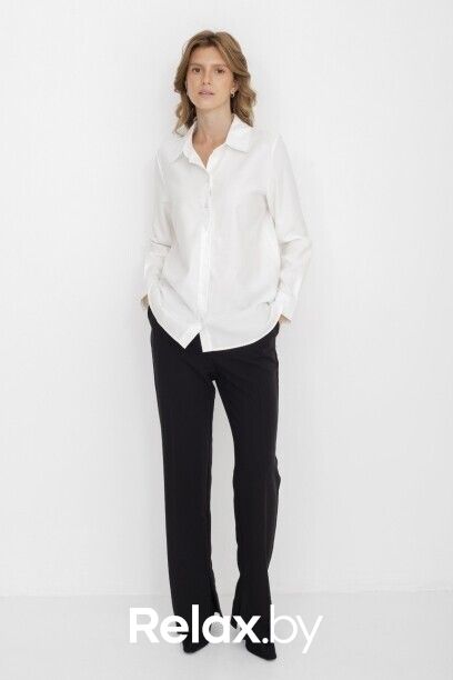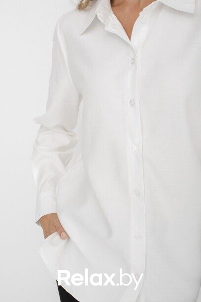 Классическая белая блузка капсулы City Night. Материал изделия: вискоза, полиэстер. Прямой крой. Длина до середины ягодиц. Застёжка на пуговицы. Манжеты с застёжкой-пуговицей. Асимметричный нижний край. Модель без декоративных элементов.