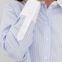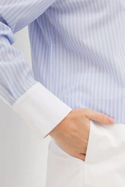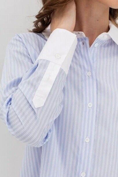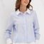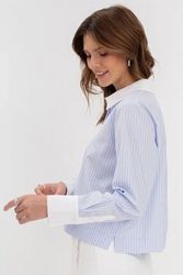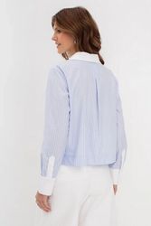 Блузка Savage коллекции Весна 2024. Материл изделия: хлопок, полиэстер. Укороченная модель. Прямой крой. Принт - мелкая светло-голубая полоска. Застежка на белые пуговицы. Акцентный воротник. Рукава с манжетами на пуговице. Страна производства: Китай.