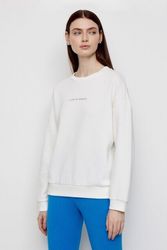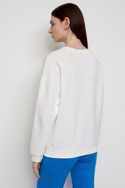 Джемпер из плотного трикотажного полотна, капсула Fresh day. Спущенная линия плеча. Длинные ракава с манжетами. Круглая горловина. Лаконичная надпись на полочке. Материал модели: хлопок, полиэстер.
