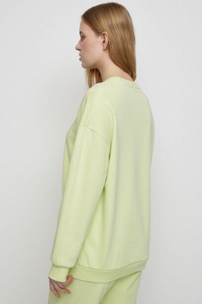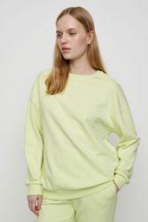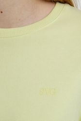 Свитшот из облегченного футера, капсула Basic. Крой оверсайз. Спущенная линия плеча. Деликатная вышивка SVG в тон ткани. Материал модели: хлопок, полиэстер.