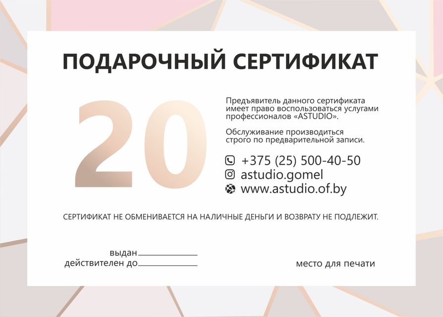 Указанная цена на Подарочный сертификат на 20 BYN ASTUDIO в Минске может отличаться от фактической. Если в описании или цене вы заметили неточность или ошибку, пожалуйста, сообщите нам на почту help@relax.by.