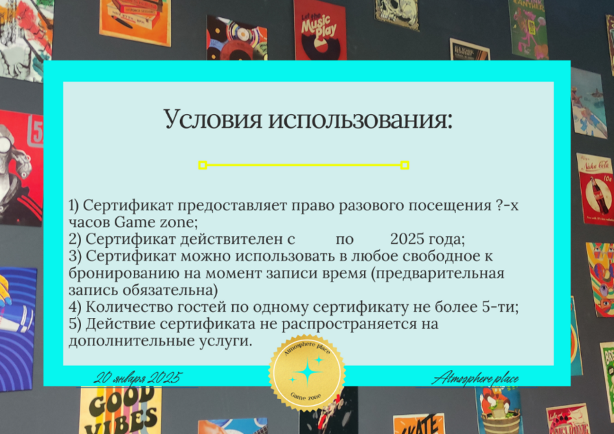Указанная цена на Подарочный сертификат на посещение «Game zone» Atmosphere в Минске может отличаться от фактической. Если в описании или цене вы заметили неточность или ошибку, пожалуйста, сообщите нам на почту help@relax.by.