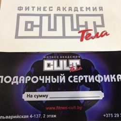 Указанная цена на Подарочный сертификат Cult Тела в Минске может отличаться от фактической. Если в описании или цене вы заметили неточность или ошибку, пожалуйста, сообщите нам на почту help@relax.by.