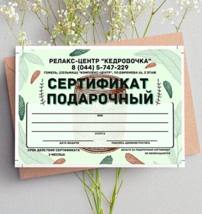 Указанная цена на Подарочный сертификат Кедровочка в Минске может отличаться от фактической. Если в описании или цене вы заметили неточность или ошибку, пожалуйста, сообщите нам на почту help@relax.by.