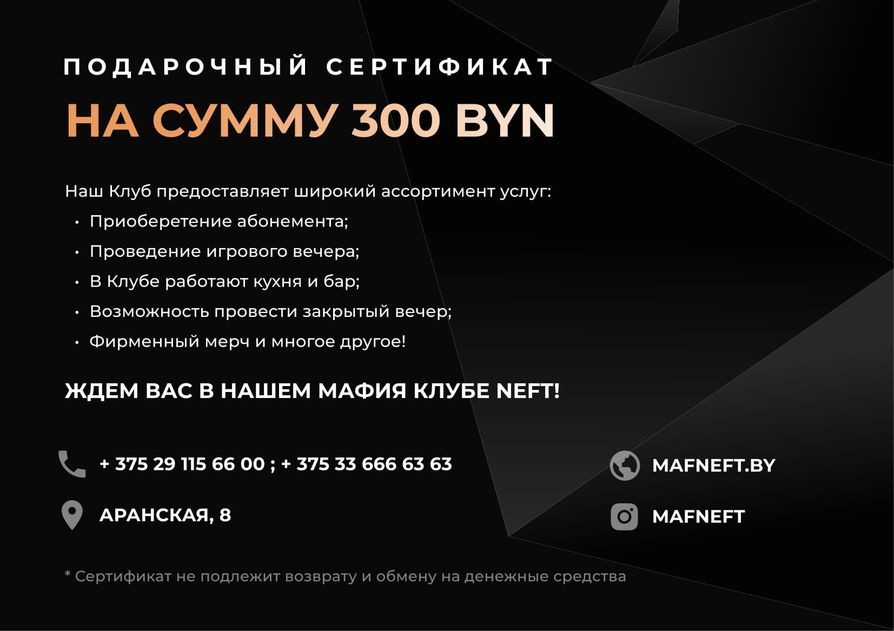 Указанная цена на Подарочный сертификат (300 BYN) NEFT Mafia Club в Минске может отличаться от фактической. Если в описании или цене вы заметили неточность или ошибку, пожалуйста, сообщите нам на почту help@relax.by.