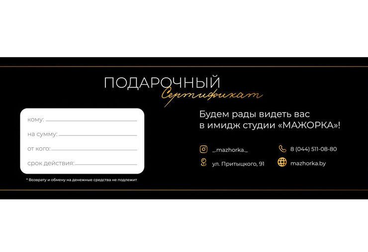 Указанная цена на Подарочный сертификат в имидж-студию Мажорка в Минске может отличаться от фактической. Если в описании или цене вы заметили неточность или ошибку, пожалуйста, сообщите нам на почту help@relax.by.