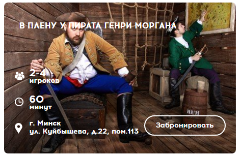 Указанная цена на Quest Zone Подарочный сертификат на квест «Сокровища Пирата Генри Моргана» Quest Zone в Минске может отличаться от фактической. Если в описании или цене вы заметили неточность или ошибку, пожалуйста, сообщите нам на почту help@relax.by.