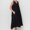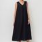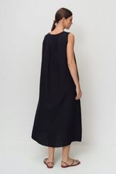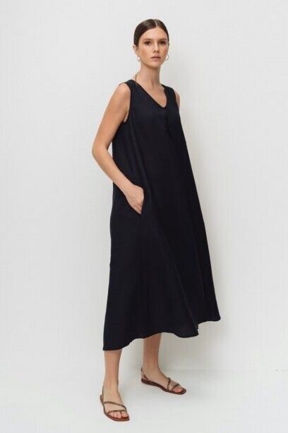 Женское платье капсулы Urban Nomad. А-силуэт, длина миди. Выполнено из мягкой ткани лен с вискозой. V-образный вырез горловины. Без рукавов, без застежки, карманы в боковых швах. Спереди встречная складка от угла горловины, по спинке складки от линии горловины.