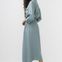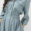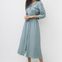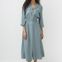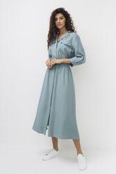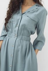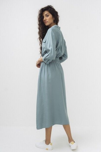 Платье-рубашка женское из вискозной ткани. Свободного силуэта, распашное отрезное по линии талии на резинке. Воротник стояче-отложной и лацканами, на полочке клапаны, спинка с кокеткой, втачной рукав 3/4 с манжетой на пуговице.