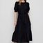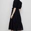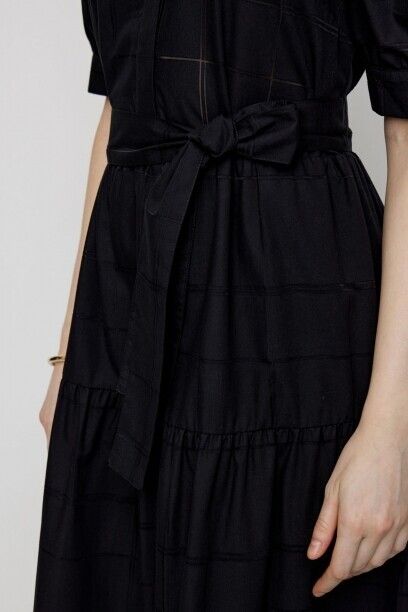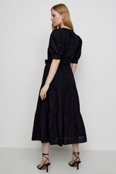 Платье в длине миди с объемными рукавами-буфами коллекции Day-to-day Весна 2023. Отрезное по линии талии. Потайня застежка на пуговицы. Пышная ярусная юбка на подкладке. В комплекте текстильный пояс.