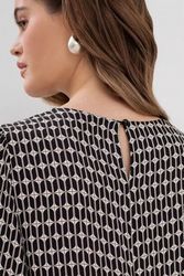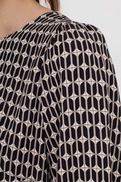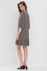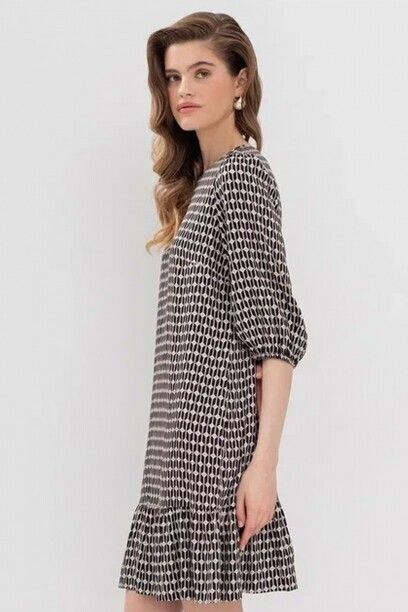 Платье с геометрическим принтом, капсула Daily Mail. Материал изделия: вискоза. Длина: до верхнего края колена. Свободный силуэт. Оборка по низу платья. Объемные рукава. Круглый вырез. Резинка по рукавам. Страна производства: Китай.