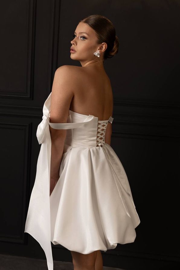 Белое короткое атласное платье обладает элегантным и утонченным дизайном. Изготовлено из мягкого и блестящего атласа, оно нежно обнимает фигуру, подчеркивая её изящество. Платье имеет классический силуэт, который подходит для различных мероприятий, будь то вечерний выход или торжественное событие.