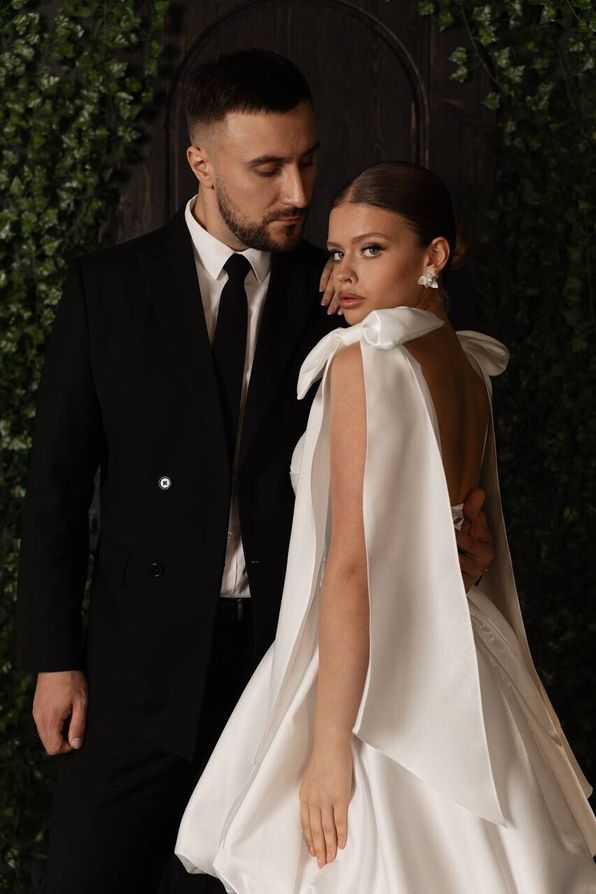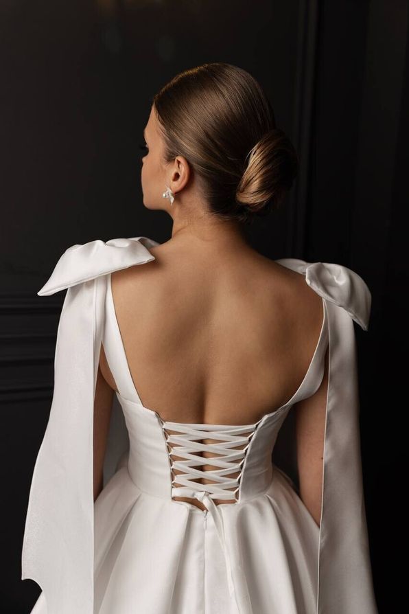 Особое внимание привлекают атласные банты, расположенные на плечах, которые добавляют образу игривости и романтичности. Эти банты могут быть как небольшими, так и более объемными. Они создают эффектный акцент и придают платью уникальность.