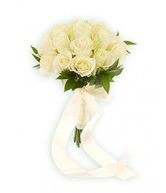 Нежный букет из 13 белых роз с рускусом, перевязанный атласной лентой.