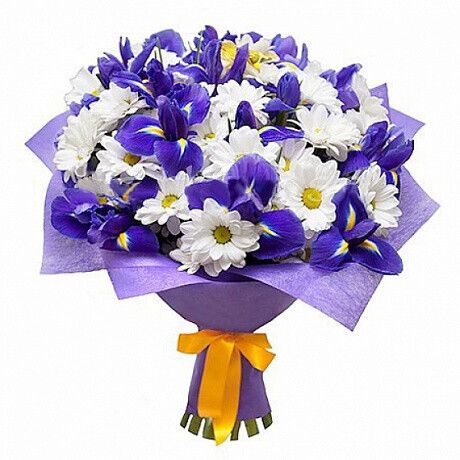 Букет из: 15 ирисов и 5 веток хризантем в декоративной упаковке.