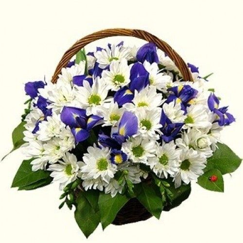 Корзина из: 13 ирисов, 7 хризантем, салал