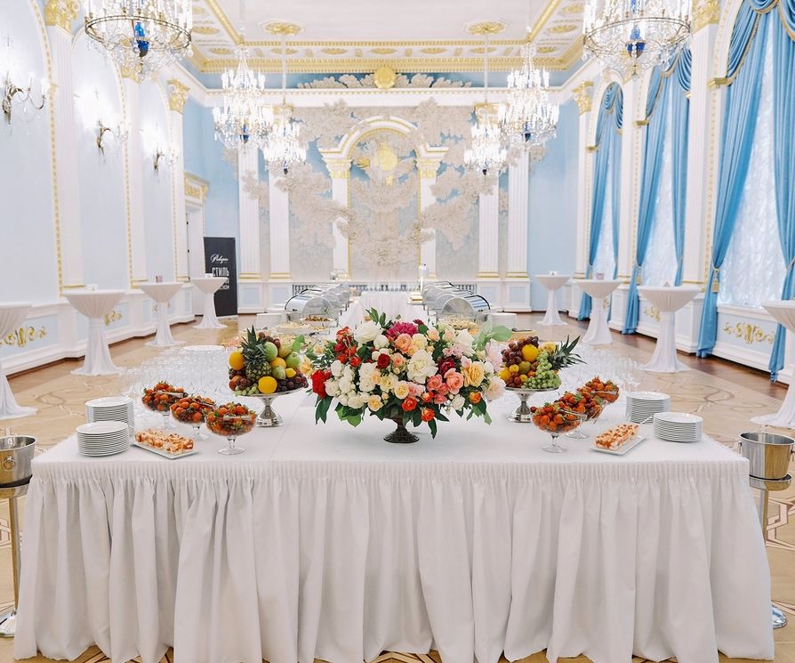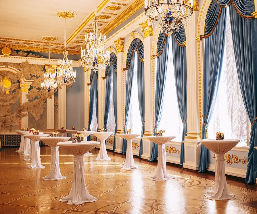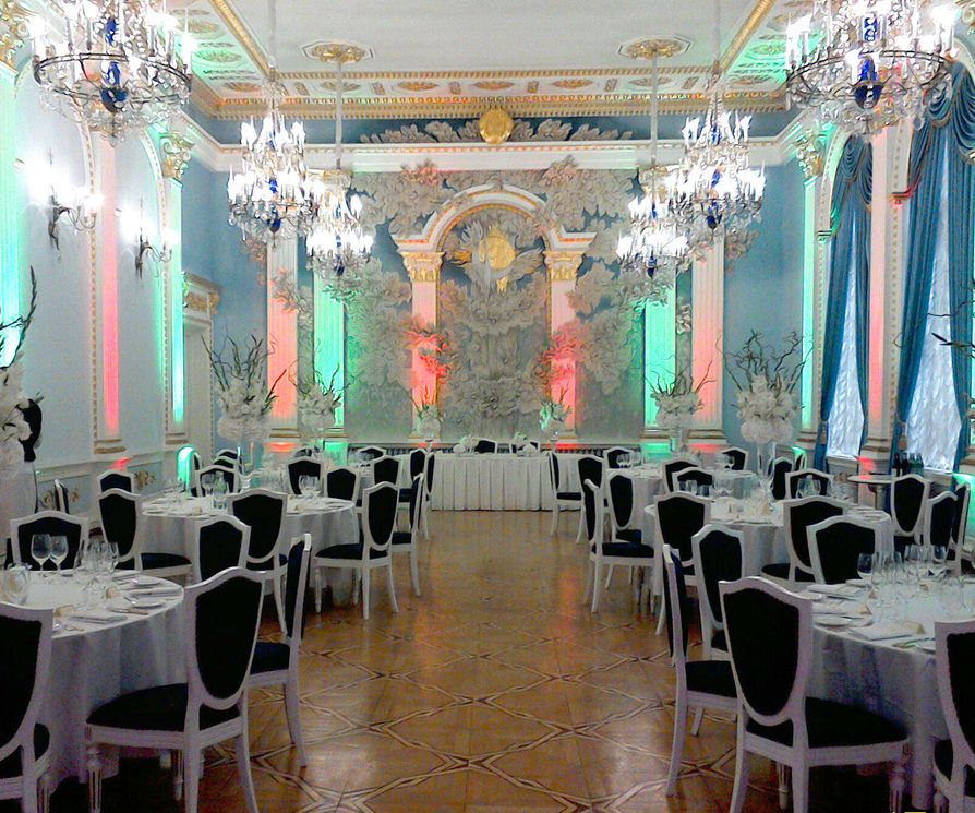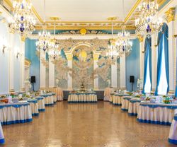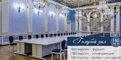Голубой зал является сердцем Dipservice Hall и идеально подходит для проведения приемов, раутов, фуршетов, банкетов и других торжественных мероприятий, которые сопровождаются угощением гостей напитками и закусками. В зале возможна любая, удобная расстановка столов, организация функциональных зон, музыкальное сопровождение, как живое, так и в записи, а также демонстрация видеоматериалов во время торжества. Кроме того, Голубой зал идеально подходит для проведения выездных церемоний регистрации брака и организаций свадебных торжеств. Особое роскошное оформление зала придает ему невероятный антураж и удивительный облик, что создает праздничное настроение у гостей и дарит самые лучшие впечатления от проведенного в нем времени.
