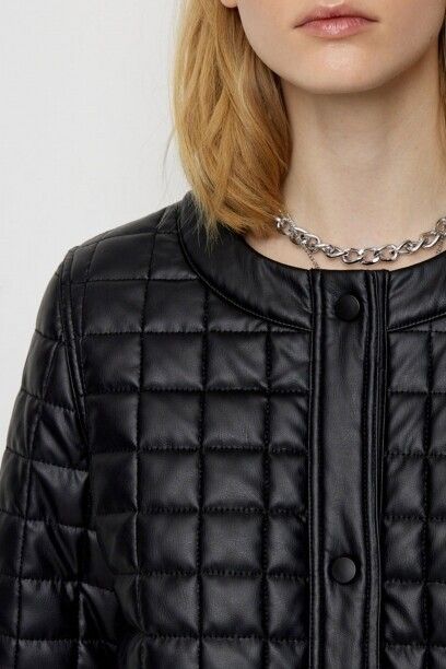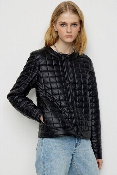 Укороченный слегка утепленный жакет из мягкой экокожи Outerwear Весна 2023. Аккуратный объем. Втачной рукав. Круглая горловина. Застежка на кнопки. Куртка на подкладке.