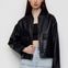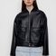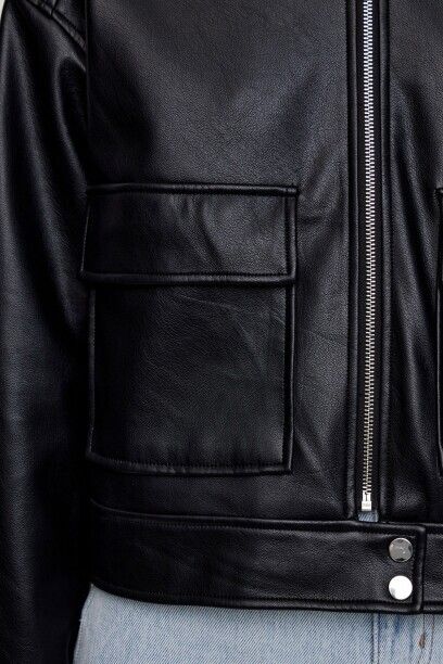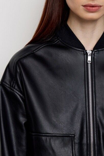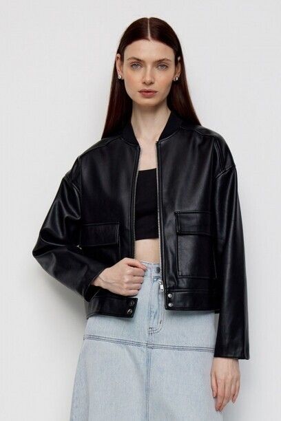 Куртка из мягкой экокожи прямого силуэта коллекции Outerwear Весна 2023. Трикотажный воротник. Накладные карманы с клапанами. Прямой спущенный рукав. По низу планка с кнопками. Застежка на молнию.