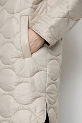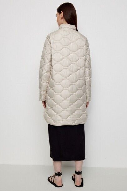 Пальто прямого кроя с фигурными разрезами по бокам коллекции Outerwear Весна 2023. Воротник — стойка. Контрастная подкладка. Застежка на кнопки. Прорезные карманы с листочками. Втачной рукав можно регулировать по длине за счет отворота.