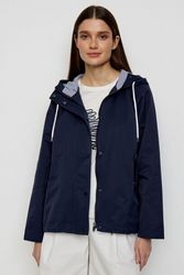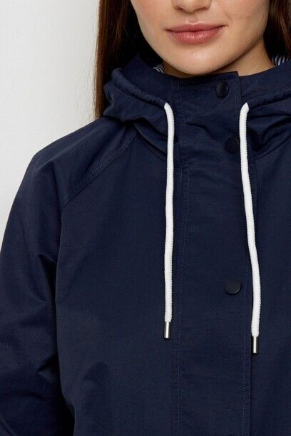 Классическая парка с подкладкой в сине-белую полоску в поддержку коллекции Outerwear Весна 2023. Застежка на молнию и планку с кнопками. Прорезные карманы с клапанами на кнопках. Контрастные белые шнурки.
