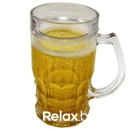 Кружка с двойными стенками. Внутри жидкость, имитирующая пенное пиво.