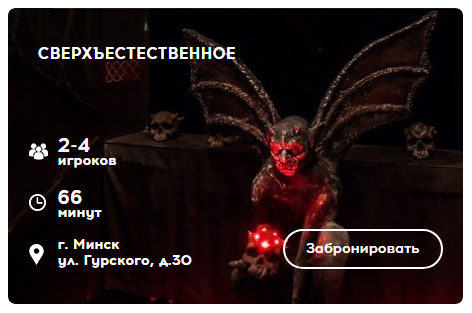 Указанная цена на Квест «Сверхъестественное» на 3 чел. Quest Zone может отличаться от фактической. Если в описании или цене вы заметили неточность или ошибку, пожалуйста, сообщите нам на почту help@relax.by.