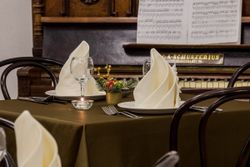 Кафе находится в одном здании вместе с Купаловским театром, в самом сердце Минска. Интерьер здесь под стать знаменитому театру – сдержанная классика. Белые стены и белые скатерти, венские стулья, а в качестве главного акцента – раритетное фортепиано.