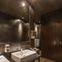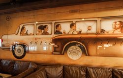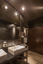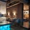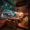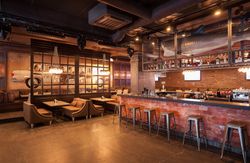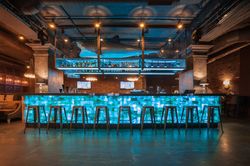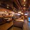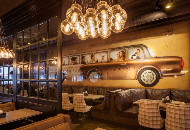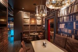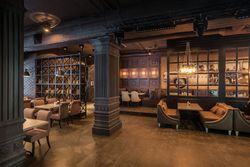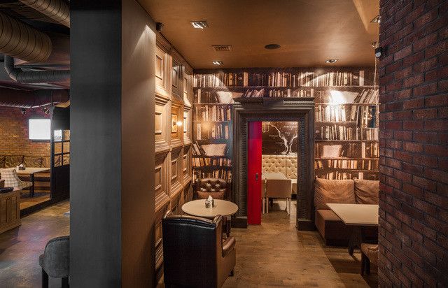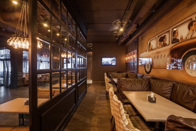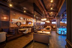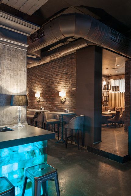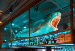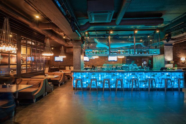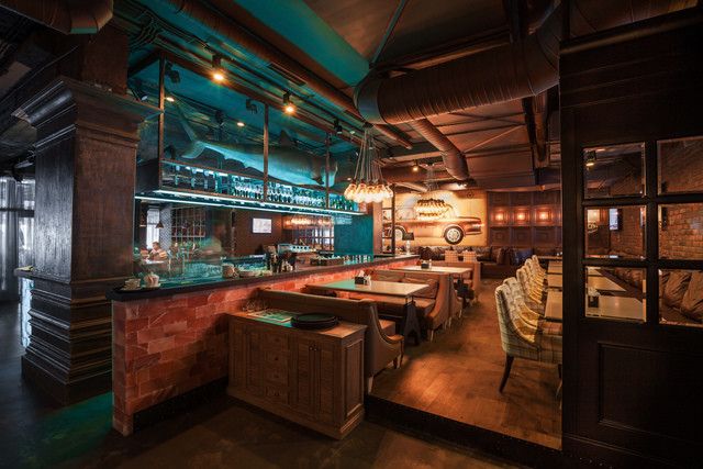 В дизайне зала хорошо читается стиль лофт: кирпичная кладка, открытые балки и трубы на потолке, много пространства, много дерева и кожи. Самые заметные акценты — соляная барная стойка и муляж 4-метровой тигровой акулы, реплика скандально известной работы художника Демьена Херста «Физическая невозможность смерти в сознании живущего». Плюс большие столы, удобные диваны и стулья, неяркий атмосферный свет.