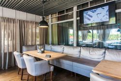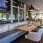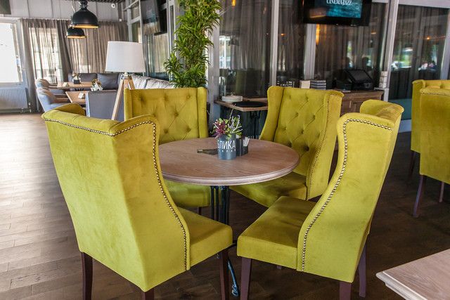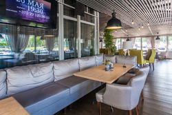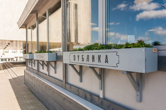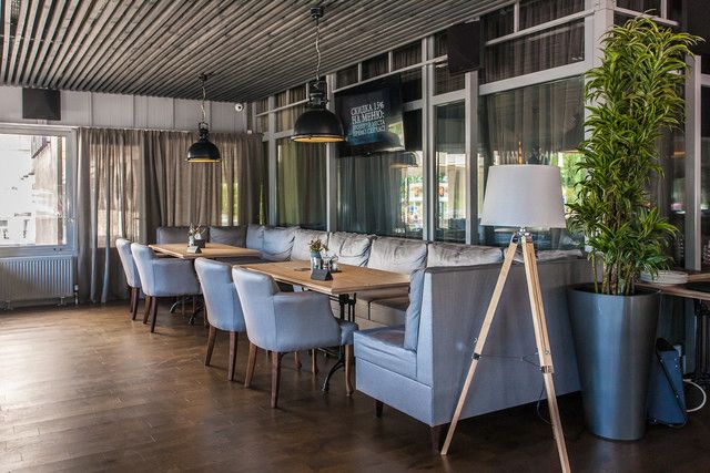 Терраса ресторана «Публика» работает круглый год, она полностью остеклена, проведено отопление. Доминирующие цвета в дизайне — серый, горчичный, бежевый. Основа интерьера — удобные кресла, столы из натурального светлого дерева и разноплановые светильники.