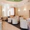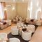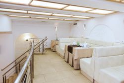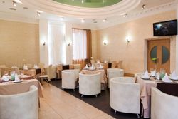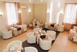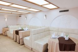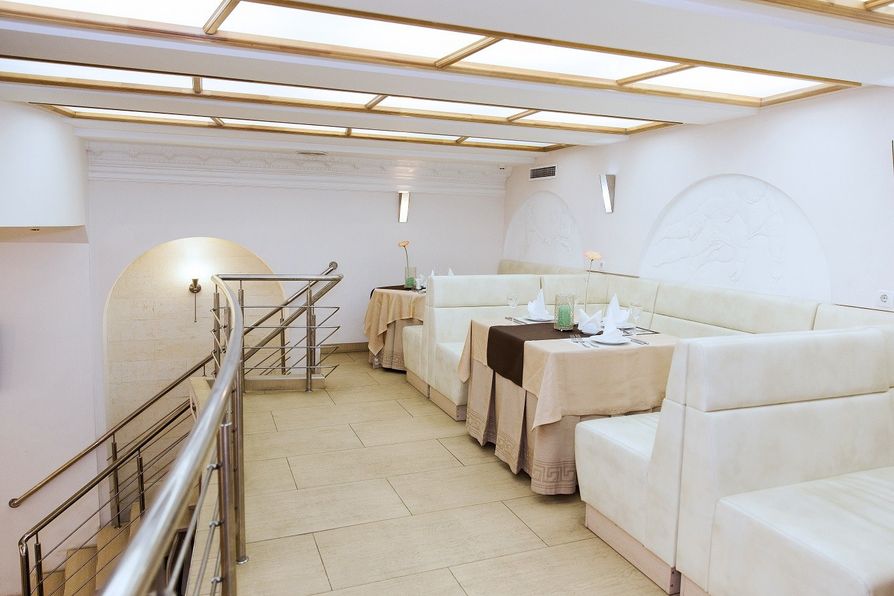 Большой зал ресторана «У фонтана» — это пространство в бежево-белых тонах с акцентом на классику в дизайне. Мягкие кресла и стулья, много света, всегда свежие скатерти и необычно оформленный потолок — интерьер ненавязчивый и уютный.