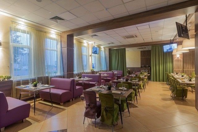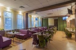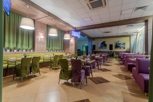 Здесь есть сцена, что позволяет проводить небольшие концерты или разместить стойку диджея. Также в основном зале установлены TV-экраны. Есть кондиционер.