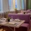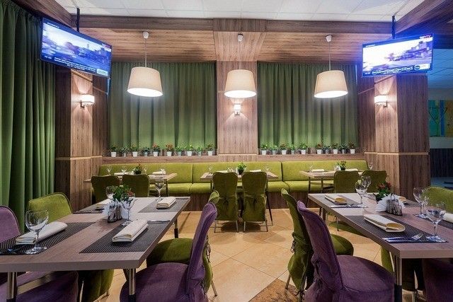 Дизайн-концепт основного зала кафе «Время есть» — это современный стиль с акцентом на естественность. В отделке и декоре использованы природные материалы: много натурального дерева, льняной текстиль и живые растения. Основные цвета в интерьере — лиловый и оливковый.
