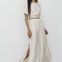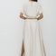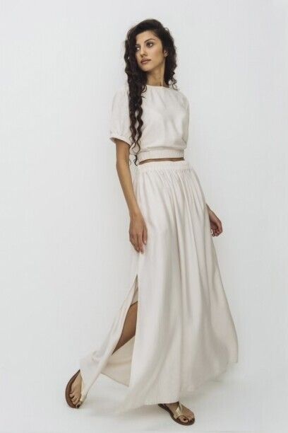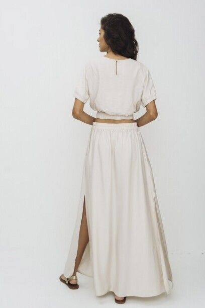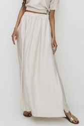 Юбка женская из однотонной вискозной ткани в бежевом цвете. Свободный трапецевидный силуэт, отрезной пояс собраный на резинку, боковые краманы в боковых швах.