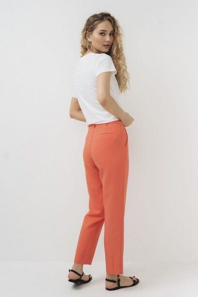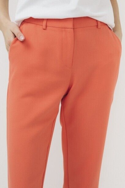 Текстильные брюки прямого покроя капсулы Monocode. Брюки выполнены из смесовой ткани с содержанием вискозы. С широким поясом, с застежкой на молнию и металличекий крючок, карманы в отрезном бочке, заужены к низу. Брюки представлены в коралловом и черном цветах.