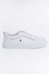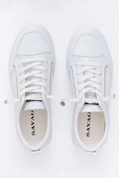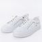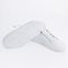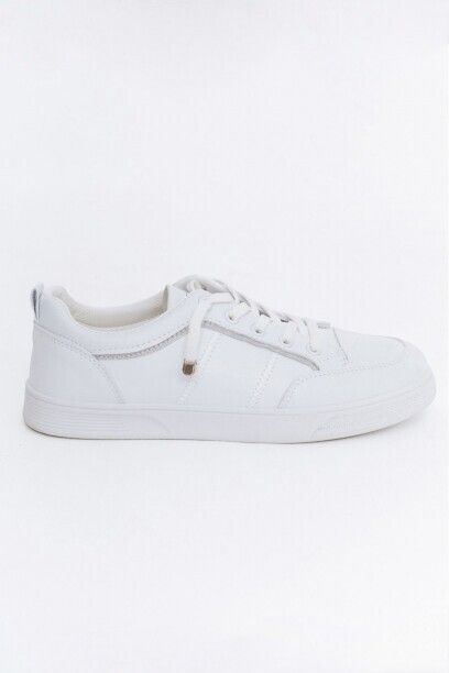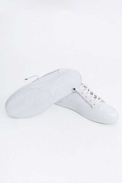 Белые кеды коллекции Весна-лето 2023. Модель выполнена из искусственной кожи. Плоская подошва, шнурки. Широкая носовая часть.