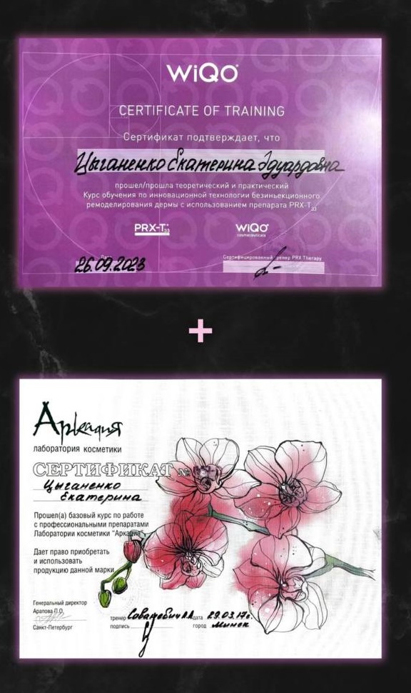 2023 г. — WiQO, сертификат о прохождении теоретического и практического курса — обучения по инновационной технологии безиньекционного ремоделирования дермы с использованием препарата PRX-T3.