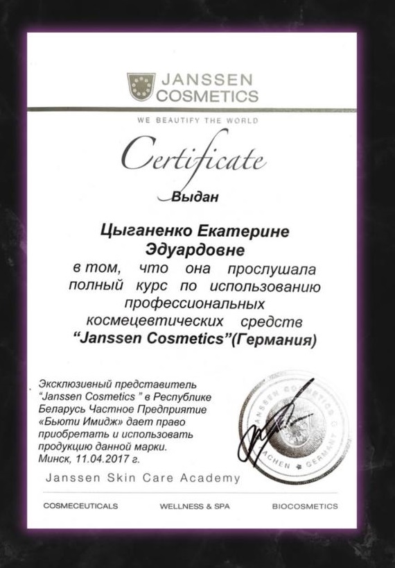 2017 г. — Эксклюзивный представитель Janssen Cosmetics в Республике Беларусь, семинар «Полный курс по использованию профессиональных космецевтических средств Janssen Cosmetics (Германия)».
