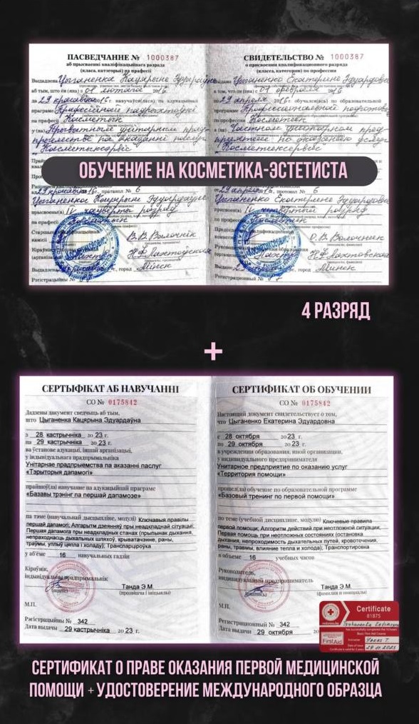 2023 г. — «Белорусский Красный Крест», сертификат о праве оказания первой медицинской помощи, получено удостоверение международного образца.