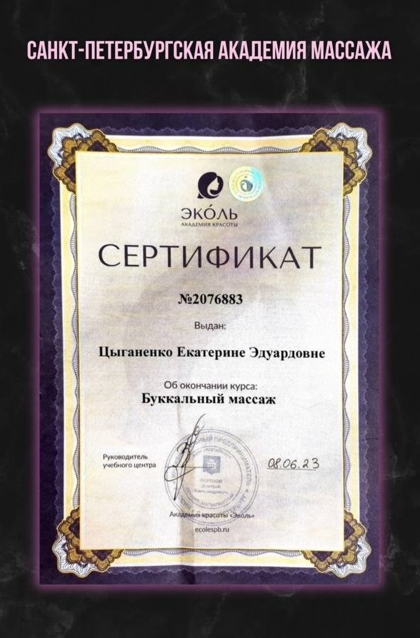 2023 г. — Санкт-Петербургская Академия массажа «Эколь», сертификат на «Буккальный массаж».