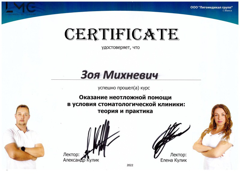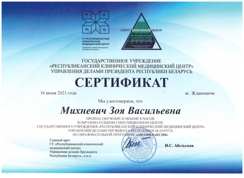 • 2019 г. — окончила «Белорусский Государственный Медицинский Университет»