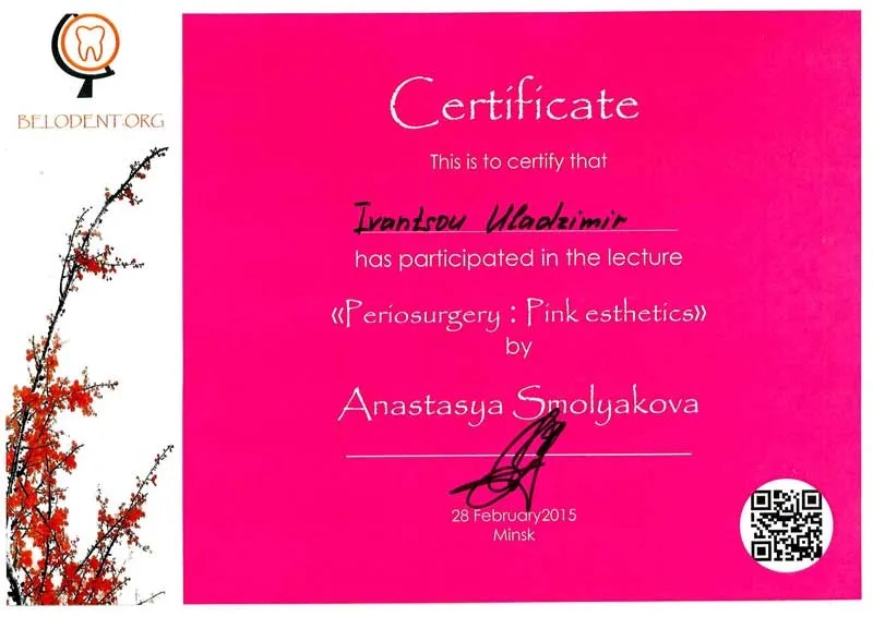 • 2015 г. — участник международного семинара Periosurgery: Pinc esthetics by Anastasya Smolyakova.