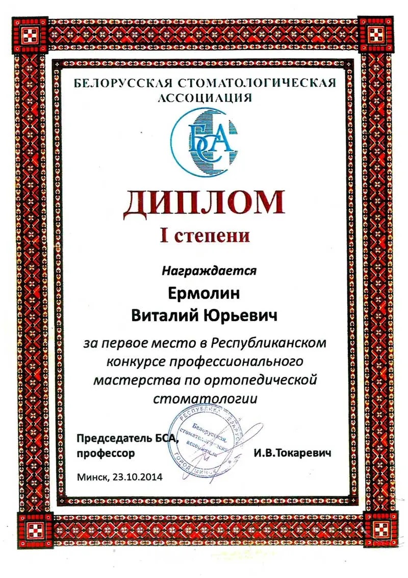 • 2012 г. — клиническая ординатура по специальности «стоматология ортопедическая».