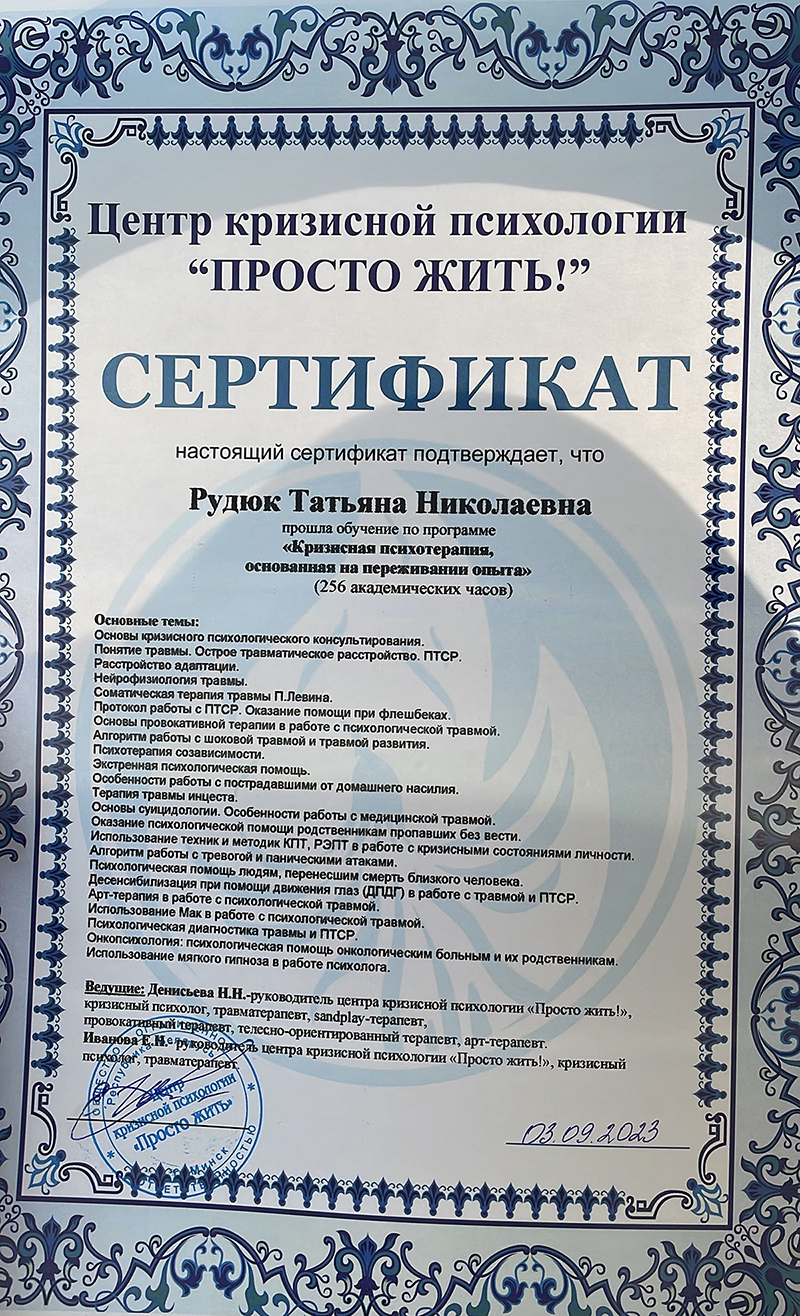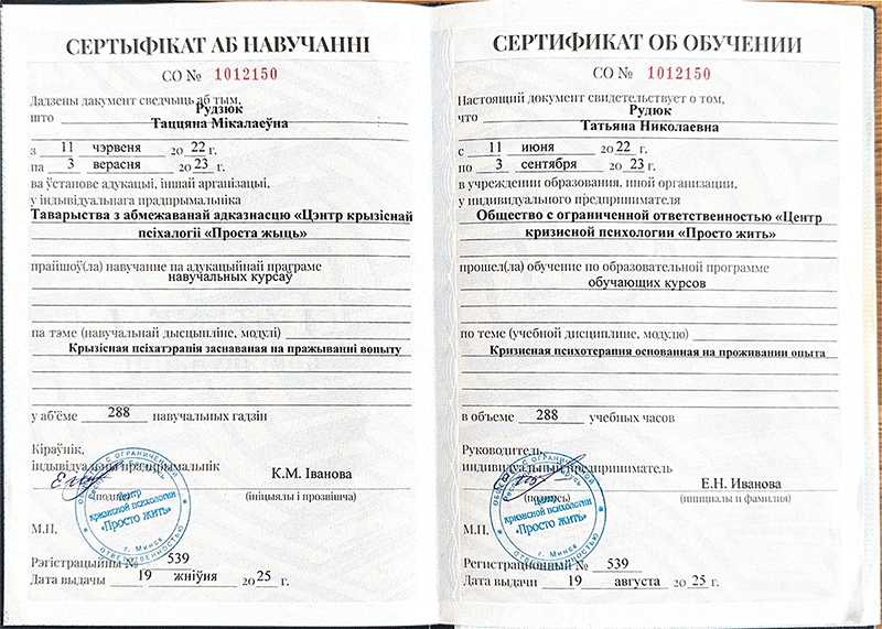• 2022–2023 г. — повышение квалификации по направлению «Кризисная психотерапия, основанная на проживании опыта», Минск;