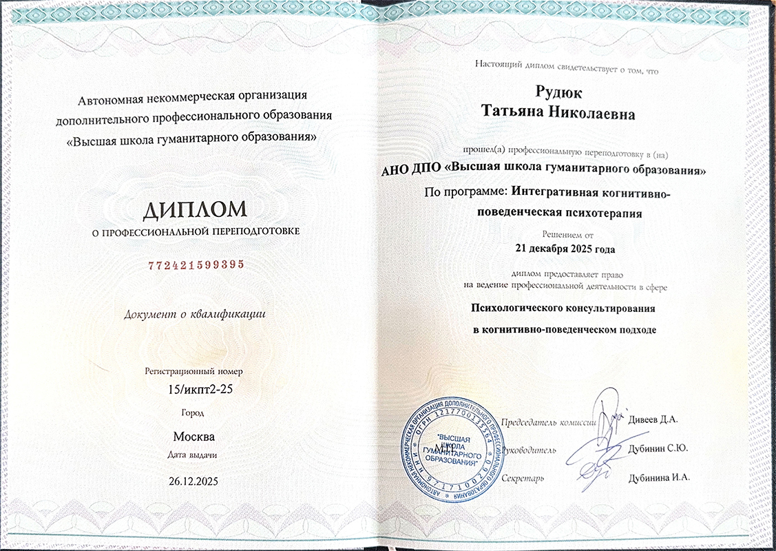 • 2025 г. — профессиональная переподготовка «Когнитивно-поведенческая психотерапия», Москва.
