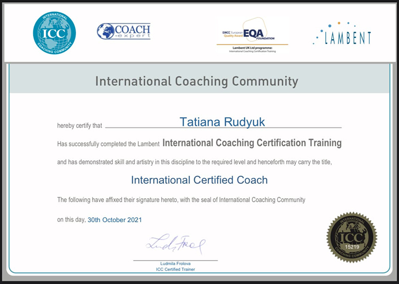 • 2021 г. — сертификация «Коуч» по программе ICC, Lambent International Training and Consulting Joseph O’Connor, Denmark;